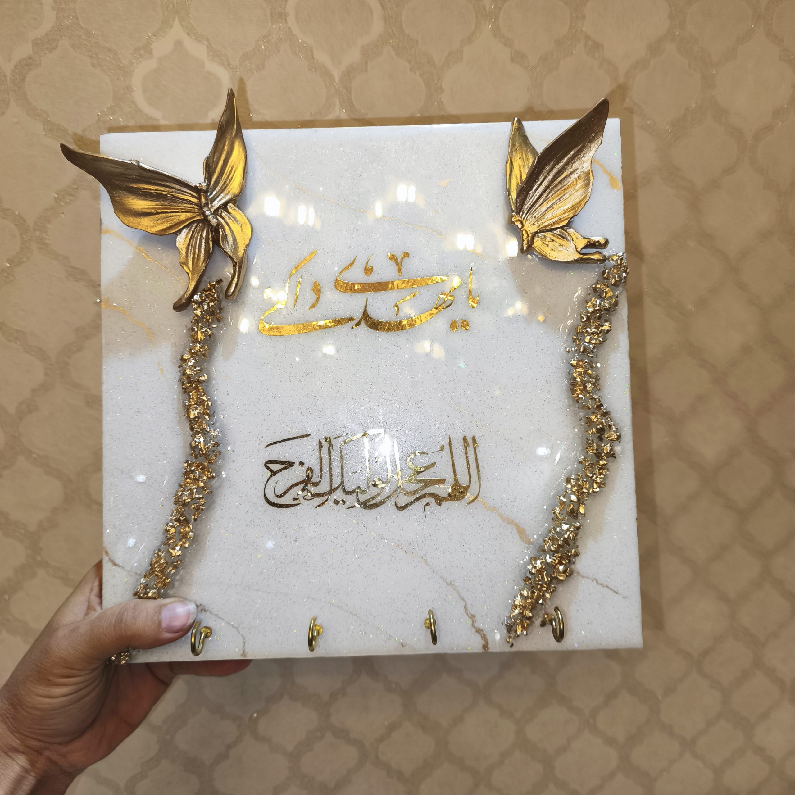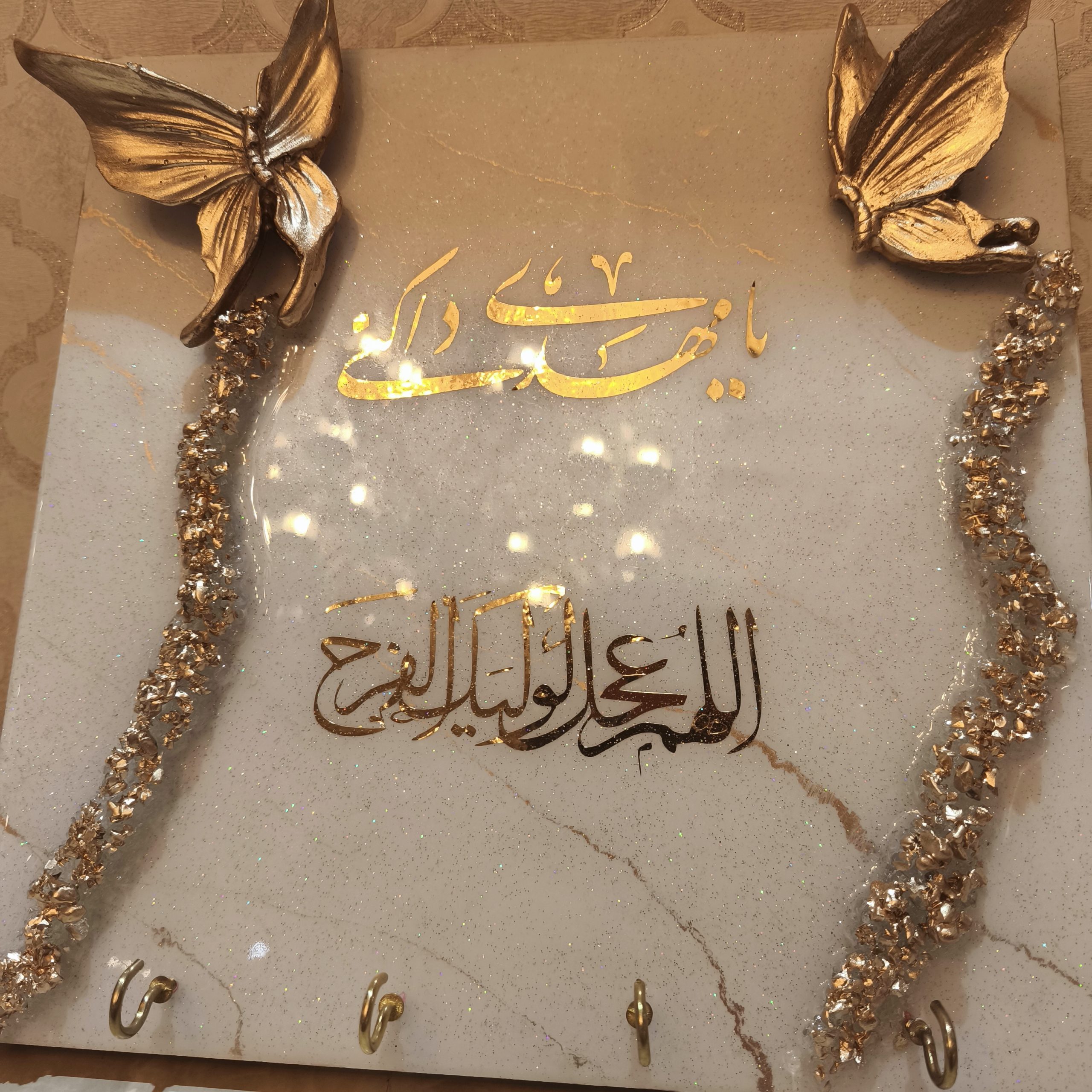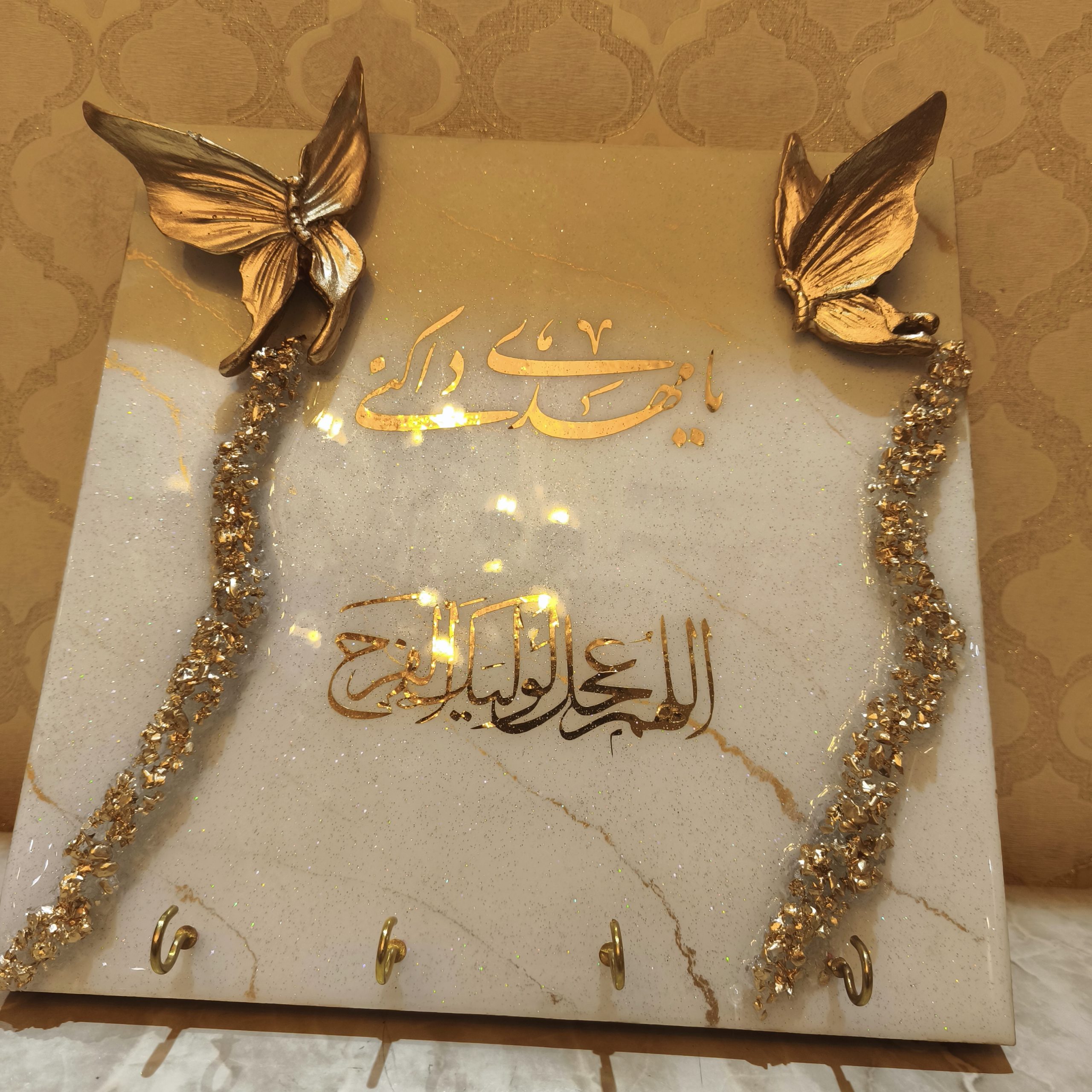 جاکلیدی دیواری طرح دعا با پروانه‌های طلایی و نقش مذهبی «یا صاحب‌الزمان (عج)»، انتخابی زیبا برای دکور ورودی خانه و هدیه‌ای معنوی و خاص برای عزیزانتان 🦋🌸